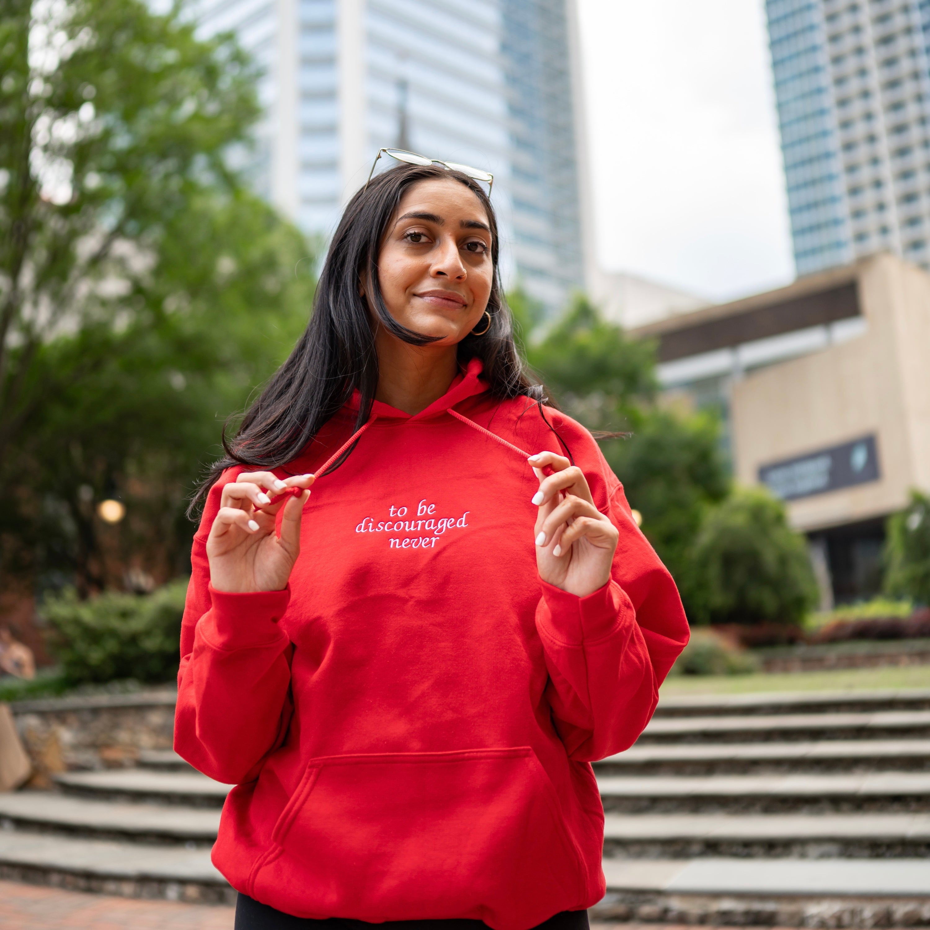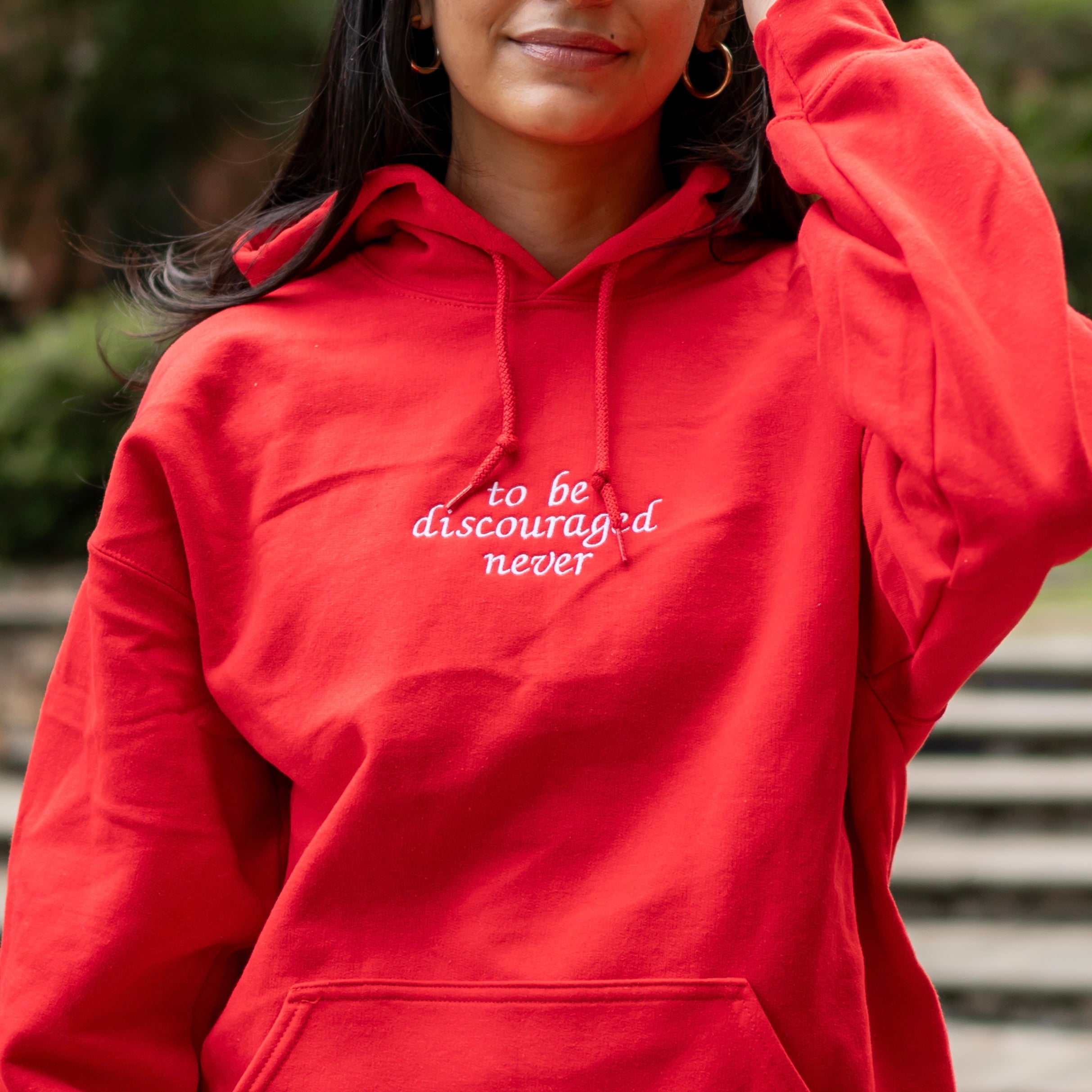 "To Be Discouraged Never" Embroidered Hoodie Sweatshirt - Chi Omega