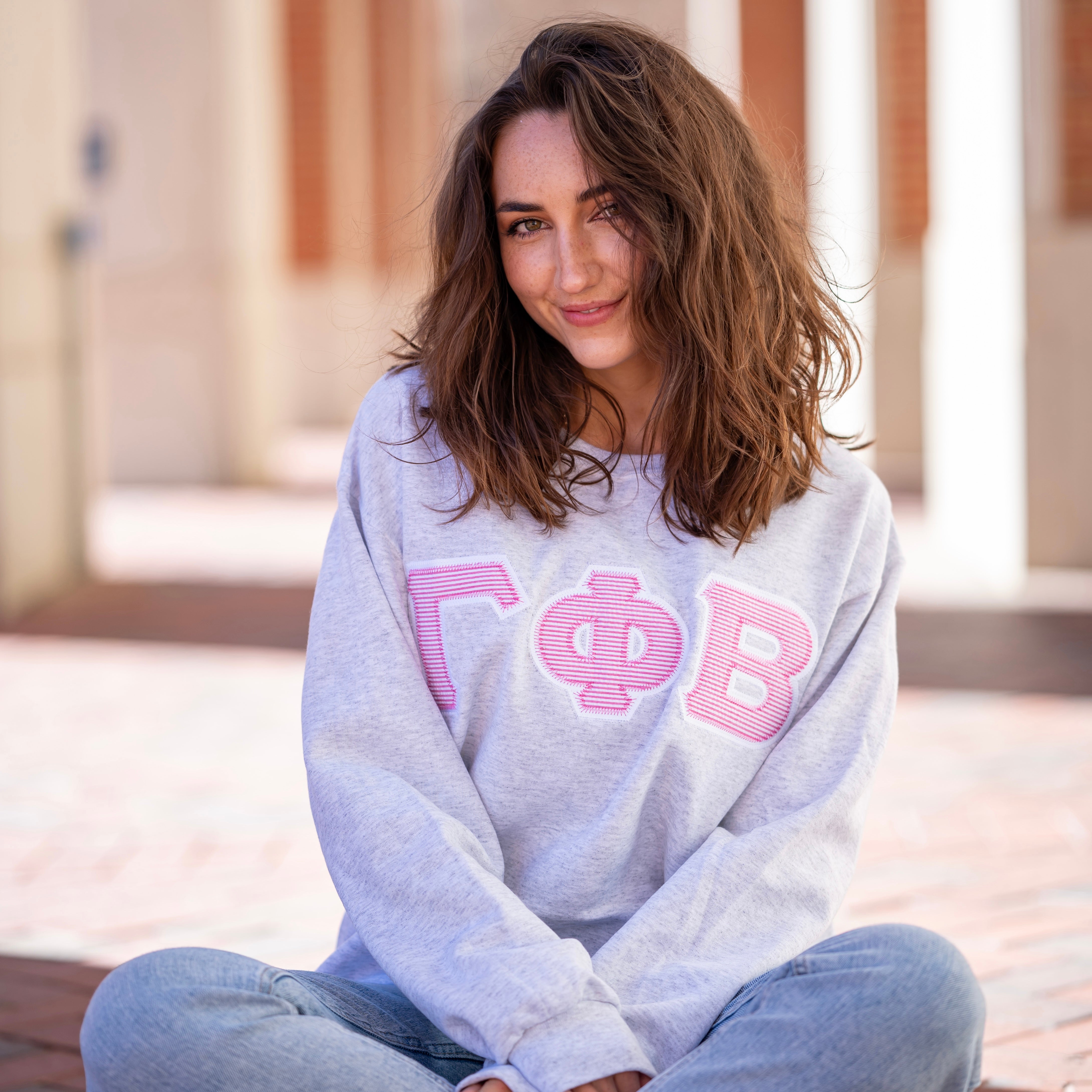 Hot Pink Seersucker Greek Letter Crewneck Sweatshirt - Gamma Phi Beta